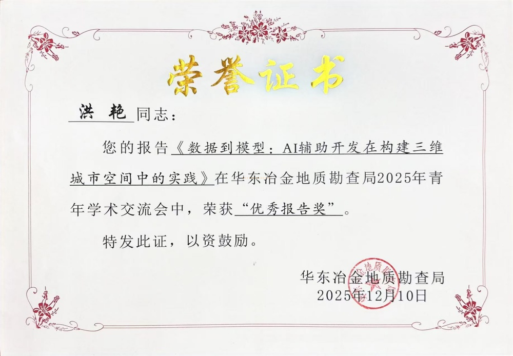 会议期间,我队参会人员同各单位青年技术骨干围绕地勘领域工作展开了深入交流,分享了各自的最新研究成果与思考。洪艳同志代表我队作专题报告,系统展示了运用AI辅助开发技术打造“华冶智慧综合管理平台”的创新成果与实践经验。汇报内容充实、逻辑清晰、表达流畅,生动展示了我队在智慧城市与地质信息化融合领域的前沿探索,得到与会专家与同行的高度评价,最终被评为全场报告第一名。