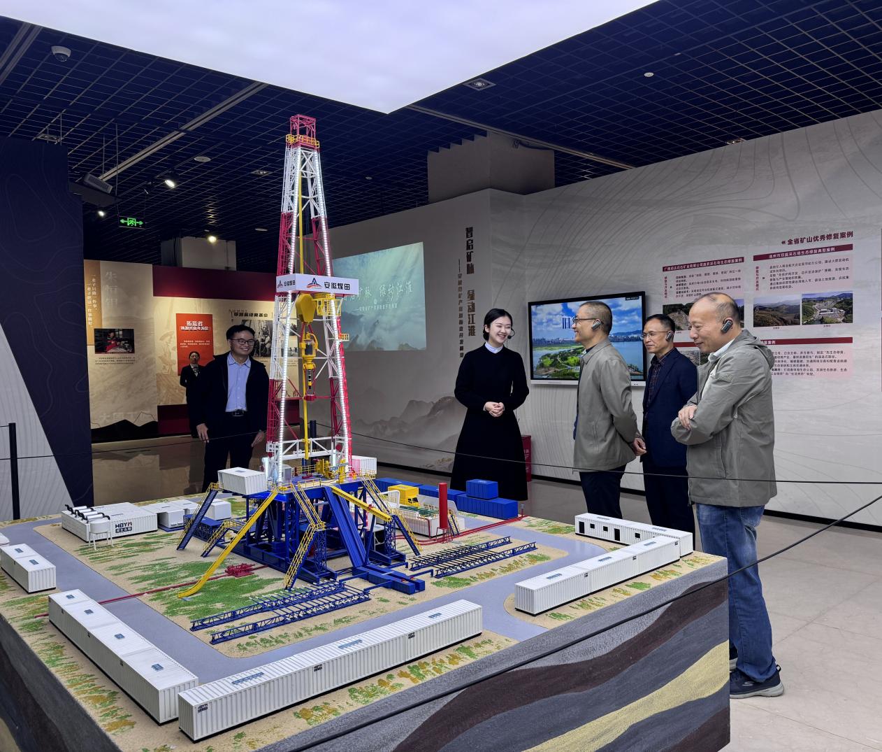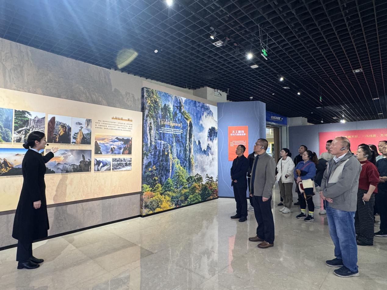 该展览以“山河表里 蕴秀藏奇”“天赋皖藏 矿耀江淮”“绿色担当 和谐共生”“情系大地 行者无疆”四大单元为叙事脉络,通过300余件实物标本、动态沙盘模型及沉浸式多媒体装置,全方位呈现了安徽地质演化史、矿产资源禀赋及地质工作者在保障国家能源资源安全、服务生态文明建设中的担当作为。参观过程中,大家认真聆听讲解,在闪烁着金属光泽的矿石标本前驻足端详,在记录地质工作者野外勘查历程的老照片前凝神沉思,并围绕过往测绘经历、技术创新方向等展开热烈交流,言语间满是对献身地质“先行官”事业的热爱与坚守。